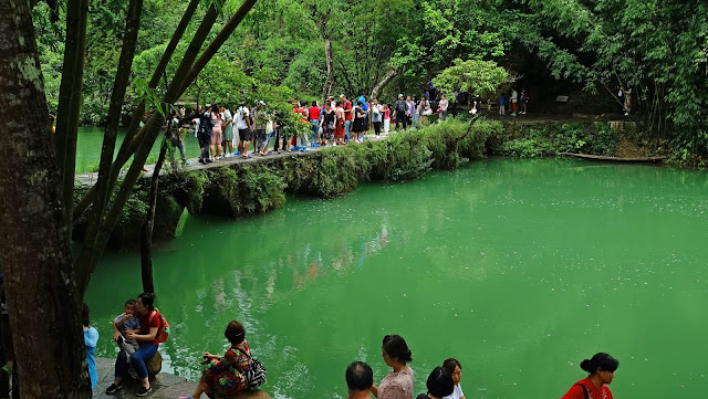 貴州從來都传說是天無三日晴的,當地更有一民間傳説去論天氣,其謔論天氣預報為"天氣亂報",但今天是預報可是非常準確,早上雨一直下到中午才逐漸地停,太陽漸露,我們依據的士司機昨天建議,為避免人多擠逼,早上0700到達大小七孔售票處(東門),因雨下得挺密,決定在小賣部添了件雨衣而前去坐觀光車,依原先網上找好的资料,直接登上發去西門盡處臥龍潭的車,這樣倒過來走向東門玩是在走下坡路省力一㸃,下了车順著人流下行10分钟,來到了臥龍潭,